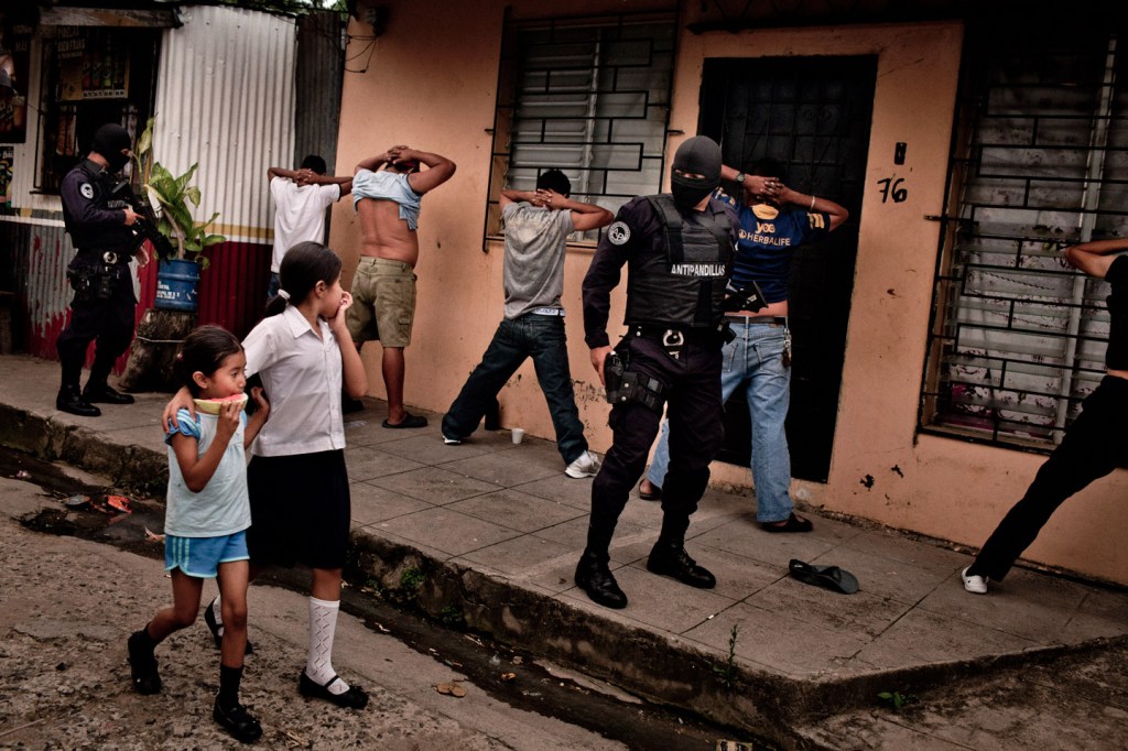 Members of a police anti-gang force search men in San Salvador, El Salvador. Aug. 14, 2012. Authorities believe peace talks involving the two largest street gangs in the country, the Mara Salvatrucha and Barrio 18, have led to a precipitous drop in violence in El Salvador, one of the hemisphere’s most violent countries. (Tomas Munita/The New York Times)
