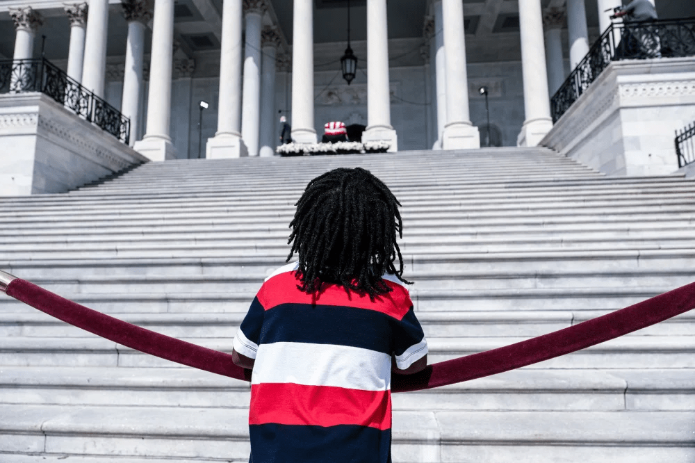 Yo veo un edifico grande. El tamaño de la foto es muy grande. El color de es blanco. Hay un chico en la foto se llama Jeremiah Harrell. Jeremiah en foto tiene una camisa rojo, blanca y negro. La foto fue tomada en Julio 28th, 2020. El chico tiene pelo largo. Jeremiah está en Washington D.C. Hay una bandera Americano en la foto. El ataúd de John Lewis también está en la foto.