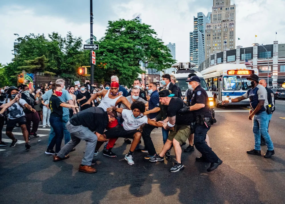 Veo gente en el fondo en una ciudad cerca de un parque en el medio de una calle hay un camión de noticias detrás de ellos junto con un autobús hay policías y otros civiles tratando de romper una pelea hay un gran edificio en la parte de atrás junto con dos torres en grandes árboles verdes. Fotógrafo Malike Sidibe.